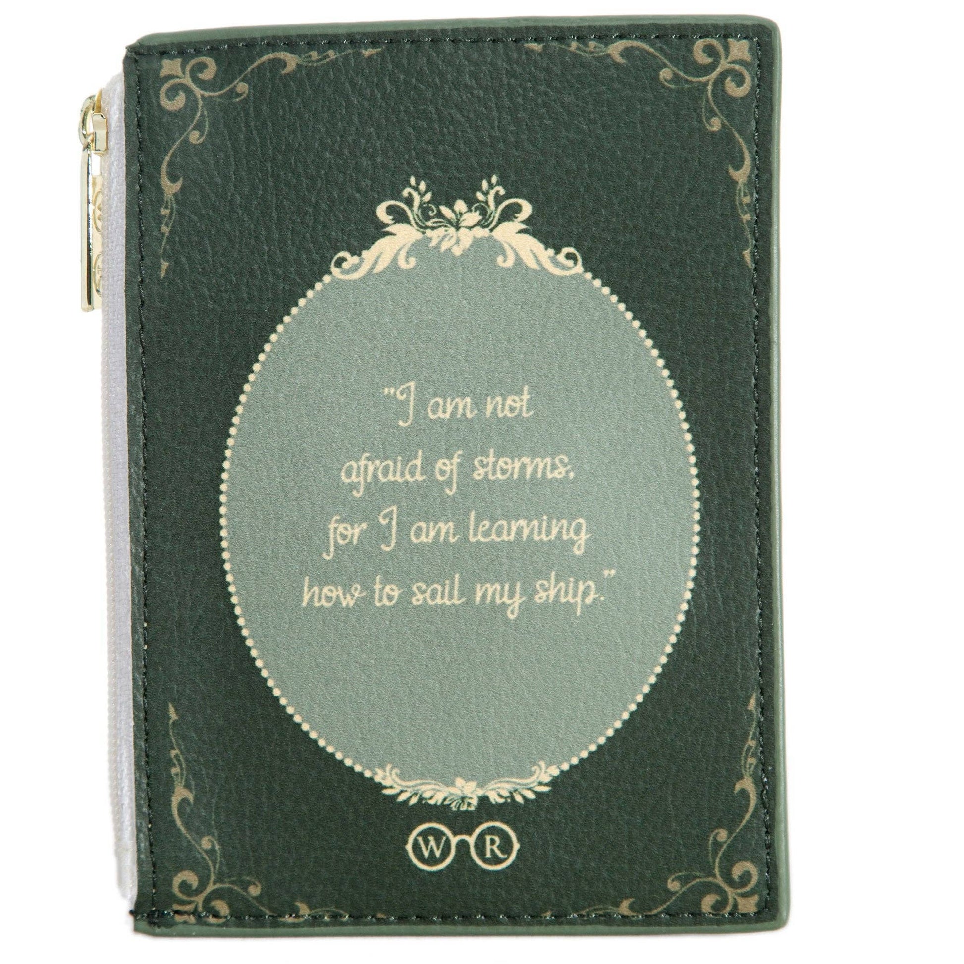 timeless Little Women. A profile of a young woman inside a delicate oval shape features on the front of this purse, with a rich green background. Made from vegan leather, the back of the purse is also decorated with the striking quote: ‘I am not afraid of storms, for I am learning how to sail my ship’.