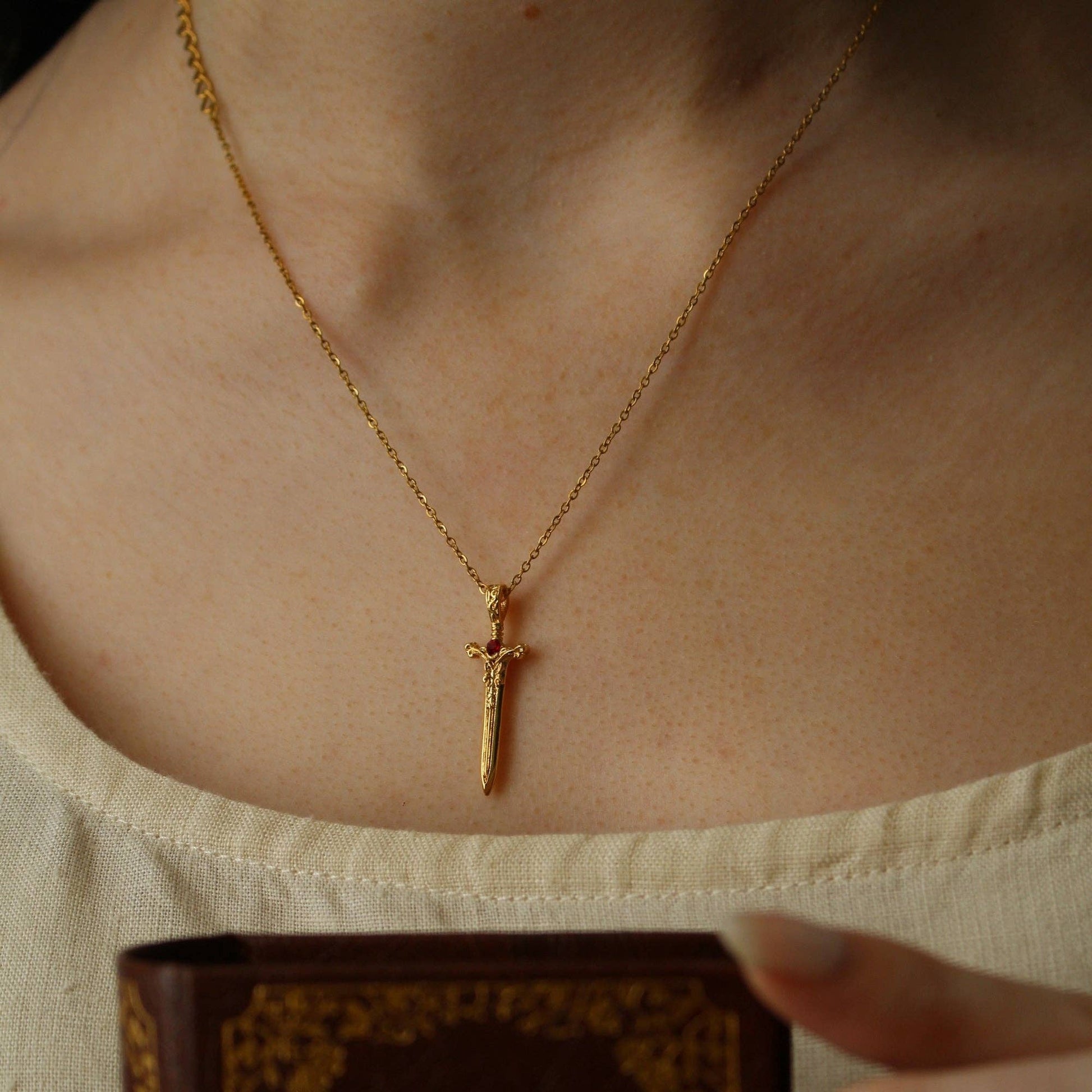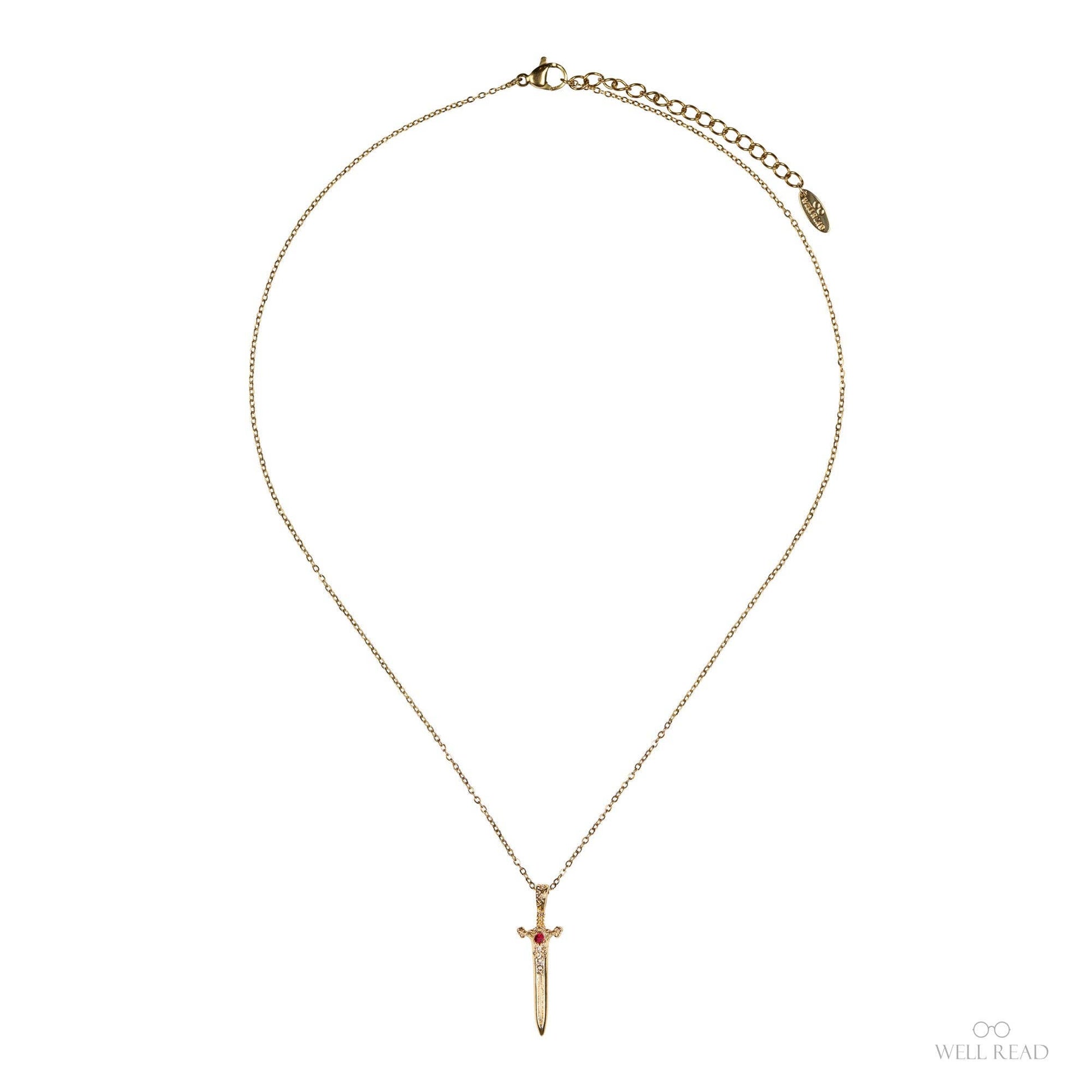The pendant features a finely cast gold plated sword: a slim blade etched with storybook filigree, a scrolling crossguard, and a crimson stone set in the centre. Suspended from a delicate, adjustable chain, it balances mythic drama with everyday elegance—an ideal companion to our The Dragon Sword Chronicles book crossbody bag.