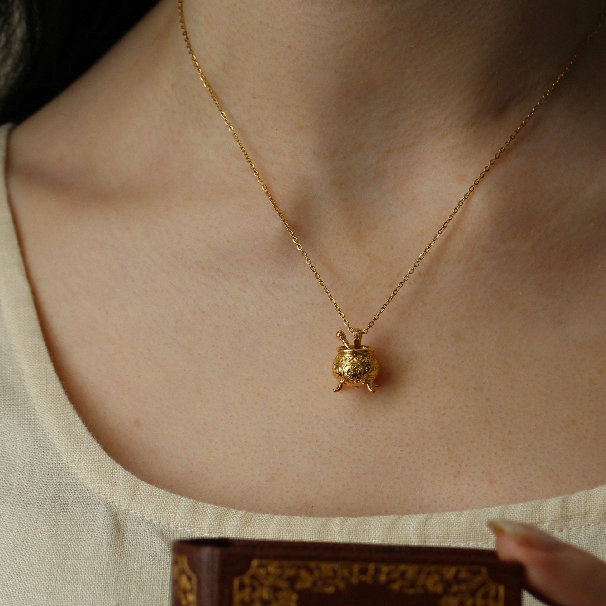 Introducing our The Encyclopedia of Potion Making gold cauldron pendant necklace, a bookish homage to wizard apothecaries and the hush of stone-walled classrooms where vials clink and steam curls above ink-stained notes. It nods to classic school-of-magic tales while celebrating the quiet craft of careful brewing.